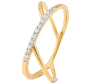 A ring that sits on your finger in a not-so-traditional way, this 14KT yellow gold ring has two parallel curves emerging out of the main element, which gives a criss-cross look when you wear it. And of course, the main element of the ring is again equipped with eleven round brilliant cut diamonds of SI2 clarity grade and I-J colour range. The diamonds sit on a rhodium-plated pave setting.